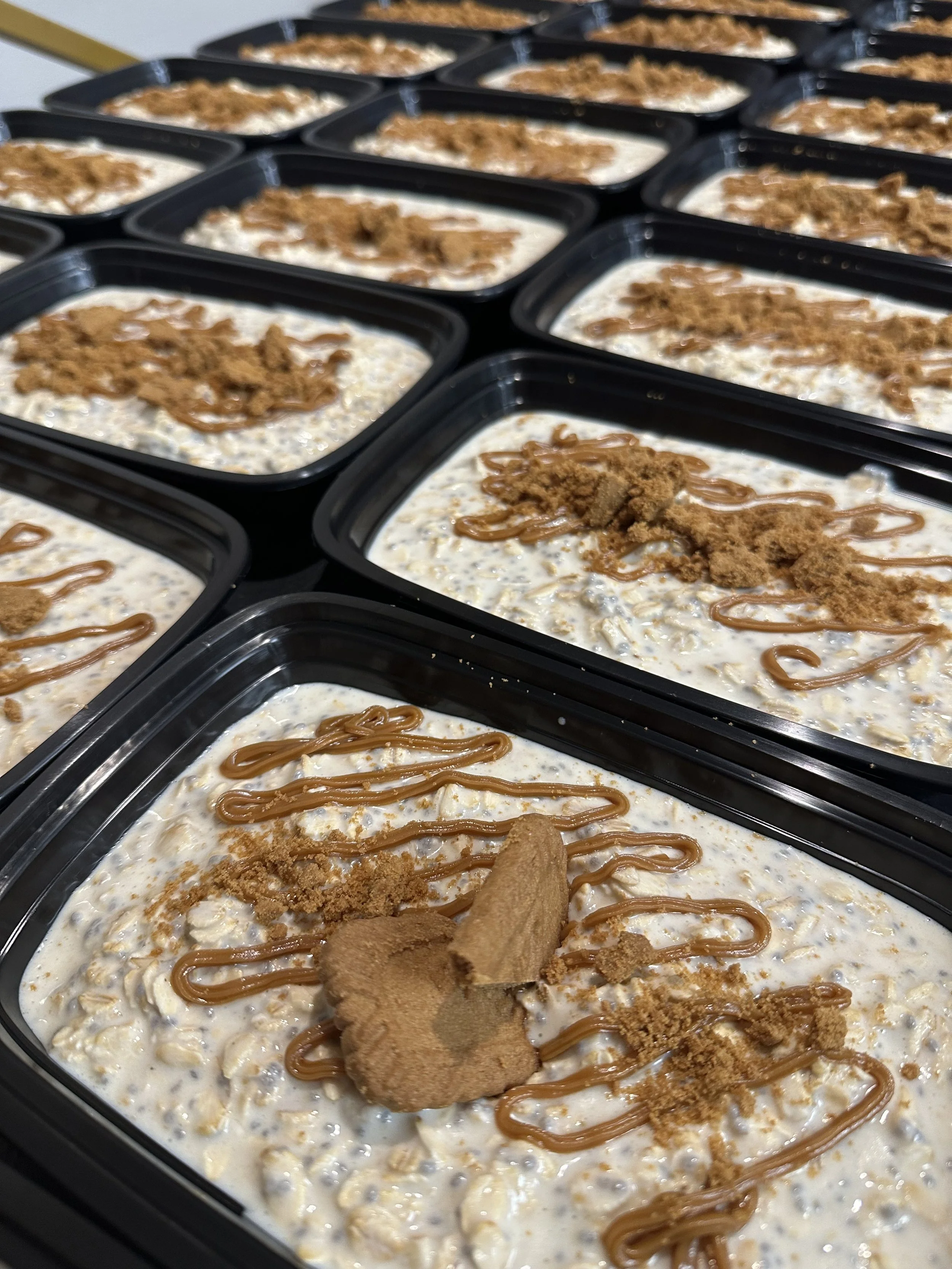 Rolled oats, Dymatize ISO100 Vanilla Whey Protein (the good stuff), chia seeds, greek yogurt, & almond milk topped with cookie butter drizzle & biscoff crumble.